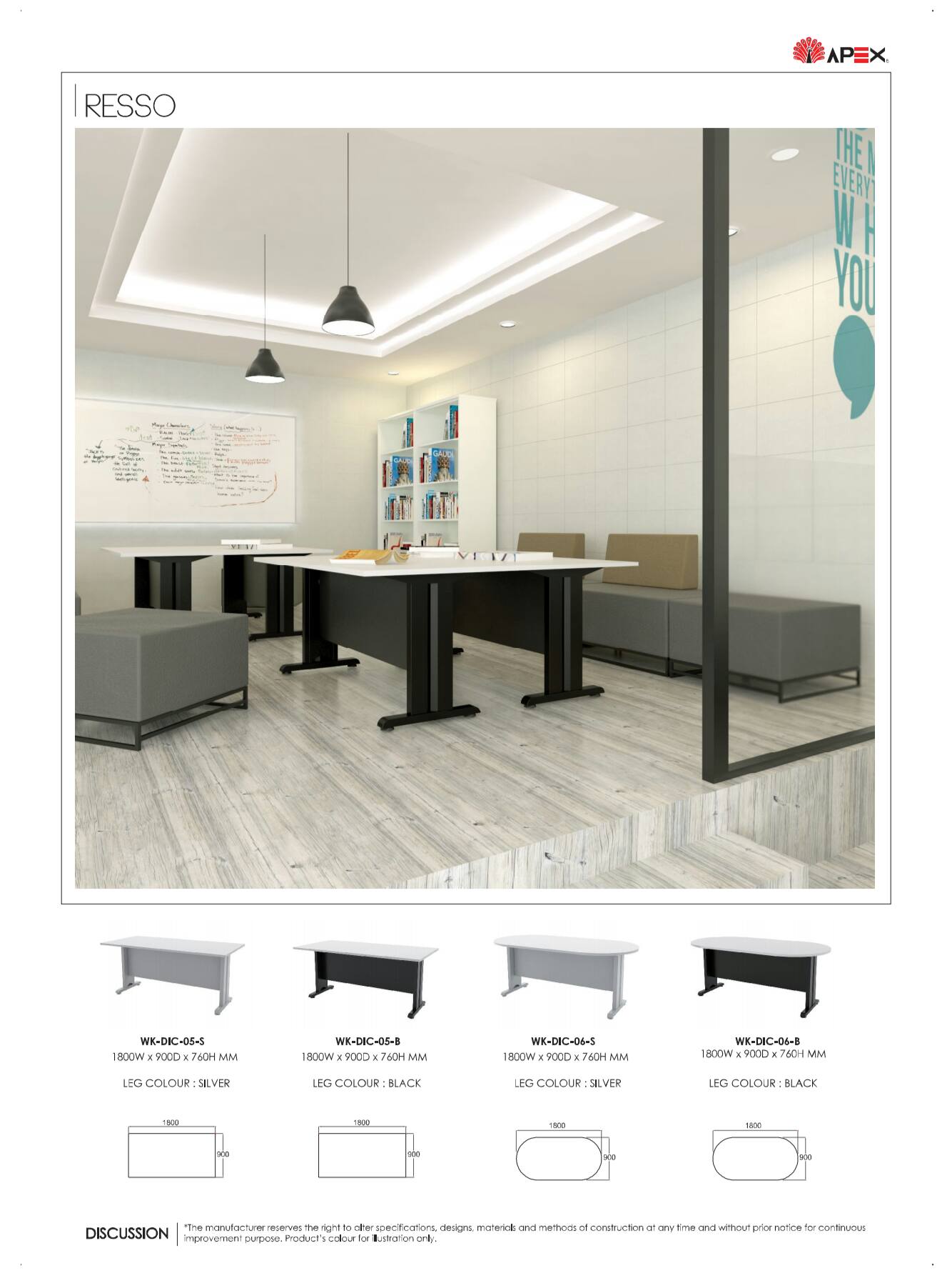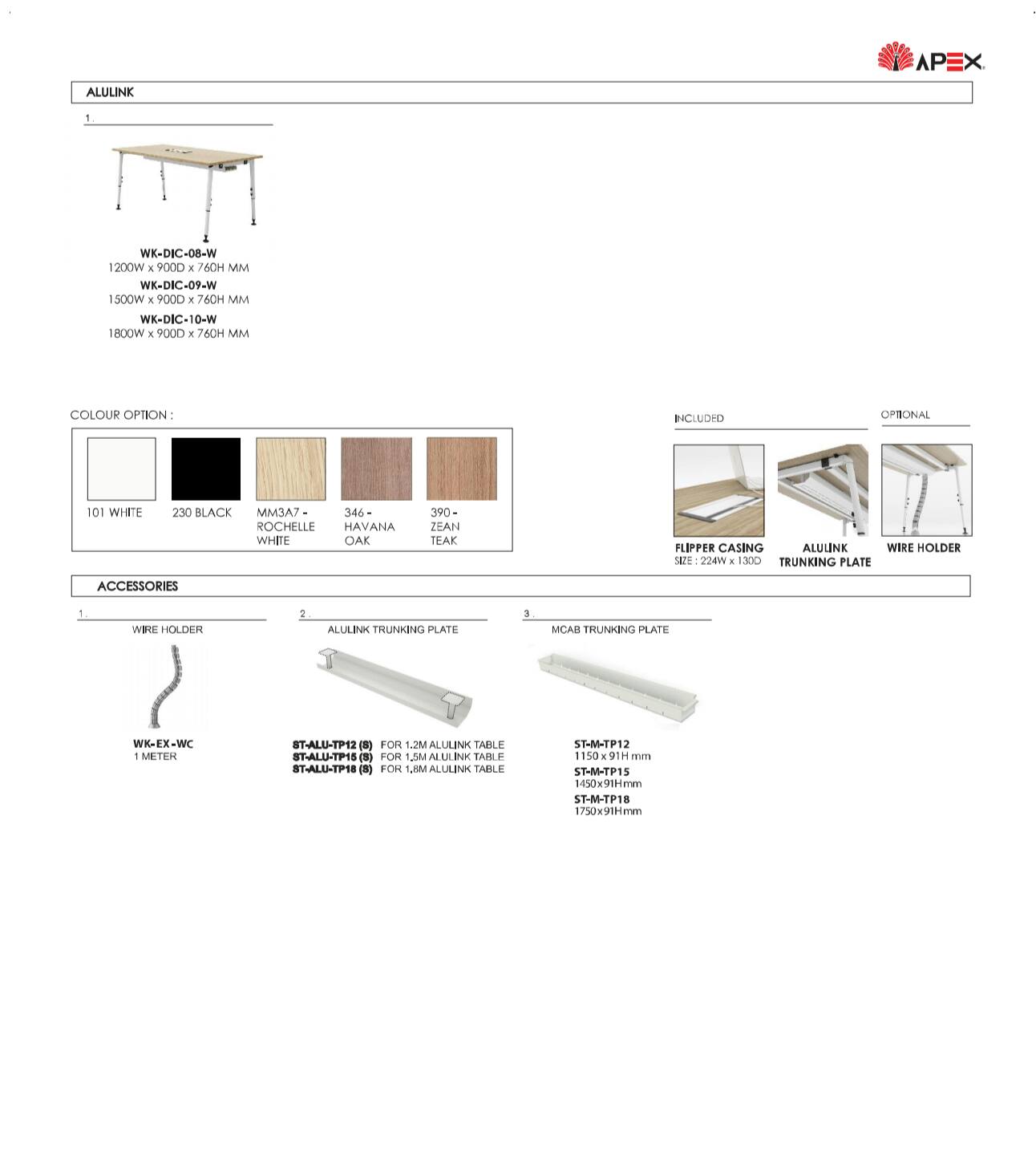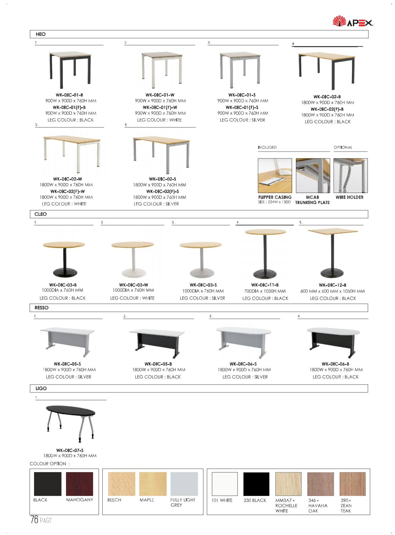 The Steel base standard in white gloss, black gloss, and silver color and table tops available laminate chipboard with variation of colors.